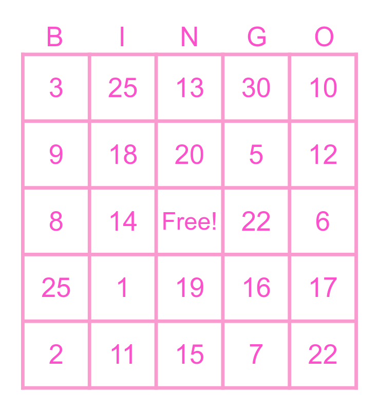 This bingo card has a free space and 24 words: 1, 11, 20, 2, 10, 3, 9, 25, 22, 19, 5, 8, 16, 17, 18, 7, 6, 13, 12, 14, 22, 25, 30 and 15.