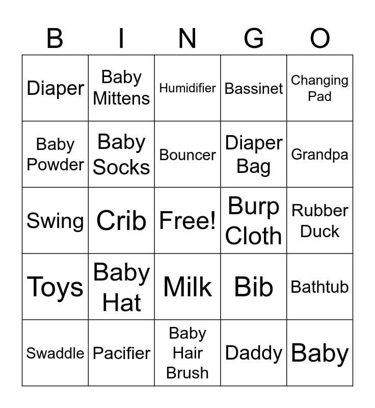 This bingo card has a free space and 50 words: Apple Sauce, Baby, Baby Bottle, Baby Hair Brush, Baby Hat, Baby Lotion, Baby Mittens, Baby Monitor, Baby Powder, Baby Shoes, Baby Socks, Bassinet, Bathtub, Bib, Blanket, Bottle Warmer, Bouncer, Burp Cloth, Car Seat, Changing Pad, Crib, Daddy, Diaper, Diaper Bag, Formula, Grandma, Grandpa, High Chair, Humidifier, Milk, Mommy, Night Light, Nursery, Onesie, Pacifier, Photo Album, Pillow, Play Mat, Rattle, Rubber Duck, Shampoo, Sippy Cup, Stroller, Stuffed Animal, Swaddle, Swing, Teether, Thermometer, Toys and Washcloth.