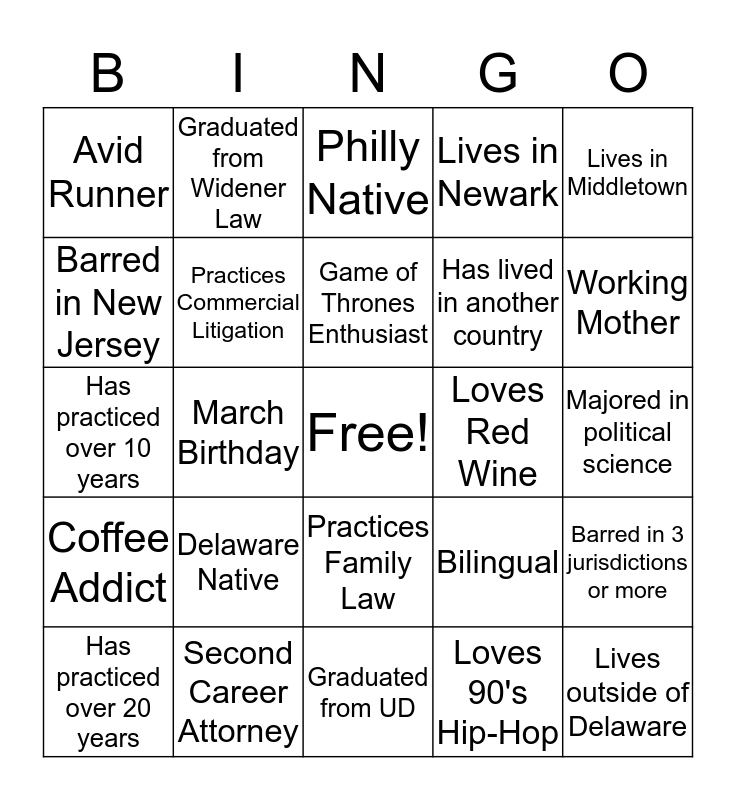 This bingo card has a free space and 24 words: Delaware Native, Second Career Attorney, Game of Thrones Enthusiast, Has practiced over 20 years, Lives in Middletown, Avid Runner, Barred in New Jersey, Graduated from Widener Law, Loves Red Wine, Practices Family Law, Has lived in another country, Has practiced over 10 years, Bilingual, Barred in 3 jurisdictions or more, Practices Commercial Litigation, Loves 90's Hip-Hop, Majored in political science, Philly Native, Working Mother, March Birthday, Lives outside of Delaware, Coffee Addict, Lives in Newark and Graduated from UD.