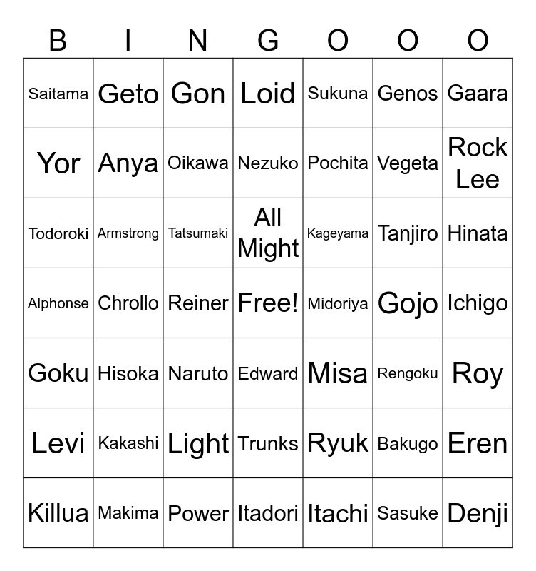 This bingo card has a free space and 48 words: Ryuk, Vegeta, Itadori, Chrollo, Tatsumaki, Ichigo, Geto, Makima, Genos, Edward, Gaara, Loid, Tanjiro, Kageyama, Levi, Gojo, Yor, Rock Lee, Bakugo, Sukuna, Pochita, Reiner, Saitama, Anya, Eren, Oikawa, Hinata, Killua, All Might, Armstrong, Sasuke, Midoriya, Roy, Kakashi, Alphonse, Misa, Rengoku, Todoroki, Naruto, Light, Goku, Denji, Gon, Power, Nezuko, Trunks, Hisoka and Itachi.