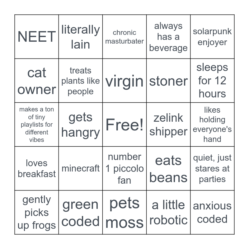 This bingo card has a free space and 24 words: minecraft, green coded, virgin, gently picks up frogs, solarpunk enjoyer, NEET, cat owner, literally lain, zelink shipper, number 1 piccolo fan, stoner, makes a ton of tiny playlists for different vibes, eats beans, quiet, just stares at parties, treats plants like people, a little robotic, likes holding everyone's hand, chronic masturbater, sleeps for 12 hours, gets hangry, anxious coded, loves breakfast, always has a beverage and pets moss.