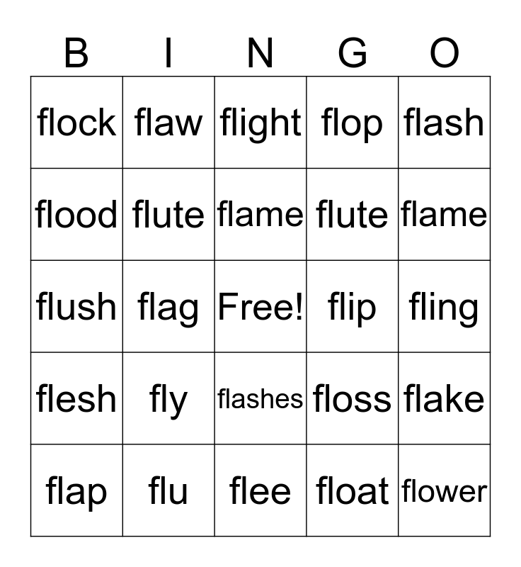 This bingo card has a free space and 24 words: fly, flu, flame, flap, flash, flock, flood, flaw, flip, flashes, flute, flush, floss, flake, flute, float, fling, flight, flame, flag, flower, flesh, flop and flee.