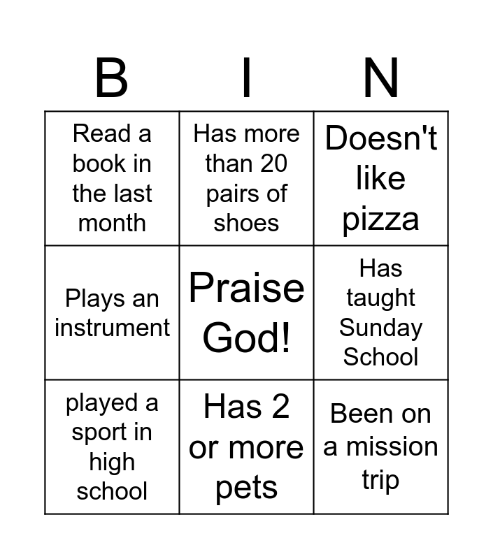 This bingo card has a free space and 8 words: Has taught Sunday School, Doesn't like pizza, Has more than 20 pairs of shoes, played a sport in high school, Read a book in the last month, Been on a mission trip, Plays an instrument and Has 2 or more pets.