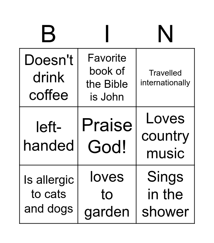 This bingo card has a free space and 8 words: Loves country music, Travelled internationally, Favorite book of the Bible is John, Is allergic to cats and dogs, Doesn't drink coffee, Sings in the shower, left-handed and loves to garden.