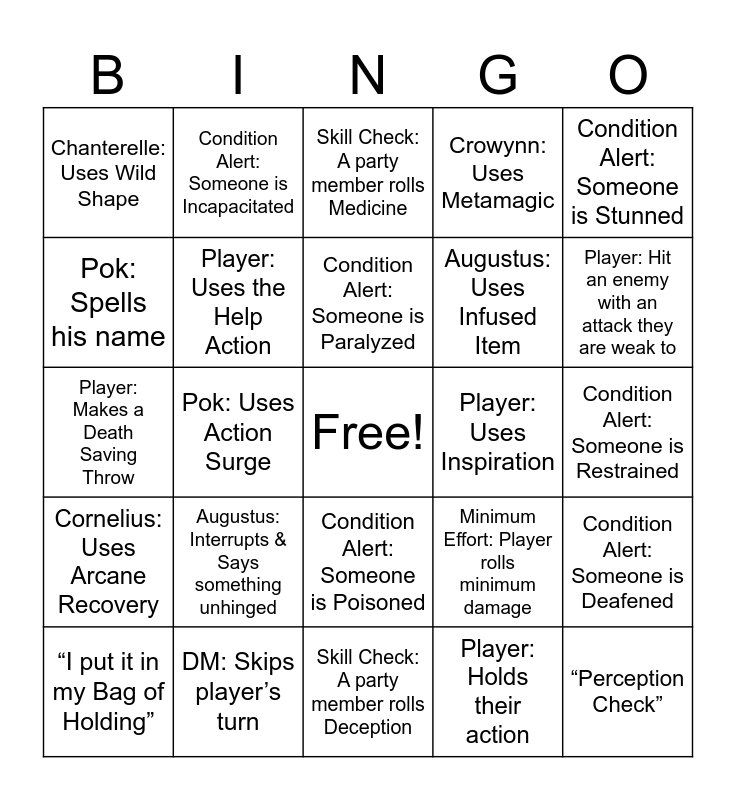 This bingo card has a free space and 65 words: Condition Alert: A player is Unconscious, Condition Alert: Someone is Blinded, Condition Alert: Someone is Charmed, Condition Alert: Someone is Deafened, Condition Alert: Someone is Frightened, Condition Alert: Someone is Grappled, Condition Alert: Someone is Incapacitated, Condition Alert: Someone is Invisible, Condition Alert: Someone is Paralyzed, Condition Alert: Someone is Petrified, Condition Alert: Someone is Poisoned, Condition Alert: Someone is Prone, Condition Alert: Someone is Restrained, Condition Alert: Someone is Stunned, Condition Alert: Someone is Flanked, Pok: Spells his name, Pok: Uses Action Surge, Chanterelle: Uses Wild Shape, Chanterelle: Uses Symbiotic Entity, Augustus: Uses Infused Item, Augustus: Interrupts & Says something unhinged, Cornelius: Uses Arcane Recovery, Crowynn: Uses Metamagic, Crowynn: Goes off on their own/Leaves group, Someone drops a die or dice, “Silvery Barbs”, “Shield”, “Roll for Initiative”, “Perception Check”, “Guidance”, “I put it in my Bag of Holding”, Critical Failure: Player rolls a Nat 1, Critical Success: Player rolls a Nat 20, Maximum Effort: Player rolls max damage, Minimum Effort: Player rolls minimum damage, DM: Skips player’s turn, DM: Forgets character’s name, Player: Makes a Death Saving Throw, Player: Holds their action, Player: Uses the Dash action, Player: Uses the Help Action, Player: Uses the Disengage Action, Player: Uses Inspiration, Player: Effects 3 or more foes with an AOE, Player: Rolls wrong Die or Dice, Player: Hit an enemy with an attack they resist, Player: Hit an enemy with an attack they are weak to, Player: Deals over 25 damage in one attack, Player: Triggers a trap, Skill Check: A party member rolls Acrobatics, Skill Check: A party member rolls Animal Handling, Skill Check: A party member rolls Arcana, Skill Check: A party member rolls Athletics, Skill Check: A party member rolls Deception, Skill Check: A party member rolls History, Skill Check: A party member rolls Insight, Skill Check: A party member rolls Intimidation, Skill Check: A party member rolls Medicine, Skill Check: A party member rolls Nature, Skill Check: A party member rolls Performance, Skill Check: A party member rolls Persuasion, Skill Check: A party member rolls Religion, Skill Check: A party member rolls Sleight of Hand, Skill Check: A party member rolls Stealth and Skill Check: A party member rolls Survival.