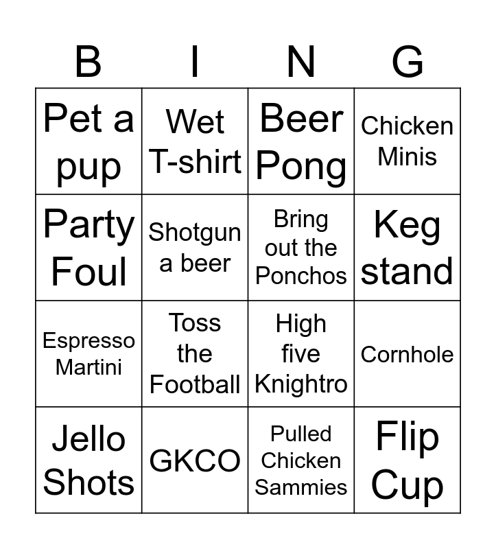 This bingo card has 16 words: Jello Shots, GKCO, Beer Pong, Chicken Minis, Party Foul, Wet T-shirt, High five Knightro, Cornhole, Pet a pup, Shotgun a beer, Pulled Chicken Sammies, Keg stand, Espresso Martini, Toss the Football, Bring out the Ponchos and Flip Cup.