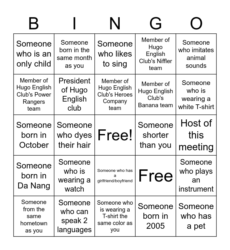 This bingo card has a free space and 25 words: Someone who is wearing a watch, Someone who is wearing a T-shirt the same color as you, Member of Hugo English Club's Heroes Company team, Someone from the same hometown as you, Someone who imitates animal sounds, Someone who is an only child, Member of Hugo English Club's Power Rangers team, Someone born in the same month as you, Someone shorter than you, Someone who has a girlfriend/boyfriend, Member of Hugo English Club's Banana team, Someone born in October, Free, Someone who plays an instrument, President of Hugo English club, Someone who has a language certification, Host of this meeting, Someone who likes to sing, Someone who is wearing a white T-shirt, Someone who dyes their hair, Someone who has a pet, Someone who can speak 2 languages, Someone born in Da Nang, Member of Hugo English Club's Niffler team and Someone born in 2005.