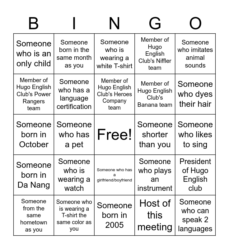 This bingo card has a free space and 24 words: Someone who is wearing a watch, Someone who is wearing a T-shirt the same color as you, Member of Hugo English Club's Heroes Company team, Someone from the same hometown as you, Someone who imitates animal sounds, Someone who is an only child, Member of Hugo English Club's Power Rangers team, Someone born in the same month as you, Someone shorter than you, Someone who has a girlfriend/boyfriend, Member of Hugo English Club's Banana team, Someone born in October, Someone who plays an instrument, President of Hugo English club, Someone who has a language certification, Host of this meeting, Someone who likes to sing, Someone who is wearing a white T-shirt, Someone who dyes their hair, Someone who has a pet, Someone who can speak 2 languages, Someone born in Da Nang, Member of Hugo English Club's Niffler team and Someone born in 2005.