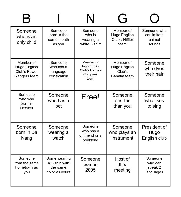 This bingo card has a free space and 24 words: Someone wearing a watch, Some wearing a T-shirt with the same color as yours, Member of Hugo English Club's Heroes Company team, Someone from the same hometown as you, Someone who can imitate animal sounds, Someone who is an only child, Member of Hugo English Club's Power Rangers team, Someone born in the same month as you, Someone shorter than you, Someone who has a girlfriend or a boyfriend, Member of Hugo English Club's Banana team, Someone who was born in October, Someone who plays an instrument, President of Hugo English club, Someone who has a language certification, Host of this meeting, Someone who likes to sing, Someone who is wearing a white T-shirt, Someone who dyes their hair, Someone who has a pet, Someone who can speak 2 languages, Someone born in Da Nang, Member of Hugo English Club's Niffler team and Someone born in 2005.
