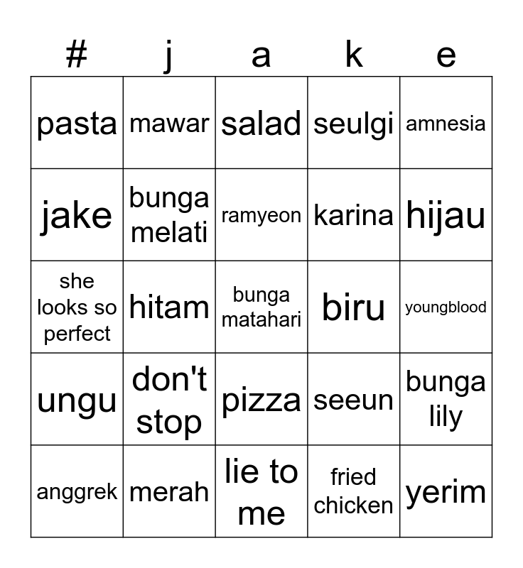 This bingo card has a free space and 24 words: don't stop, merah, ramyeon, anggrek, amnesia, pasta, jake, mawar, biru, pizza, karina, she looks so perfect, seeun, bunga lily, bunga melati, fried chicken, youngblood, salad, hijau, hitam, yerim, ungu, seulgi and lie to me.