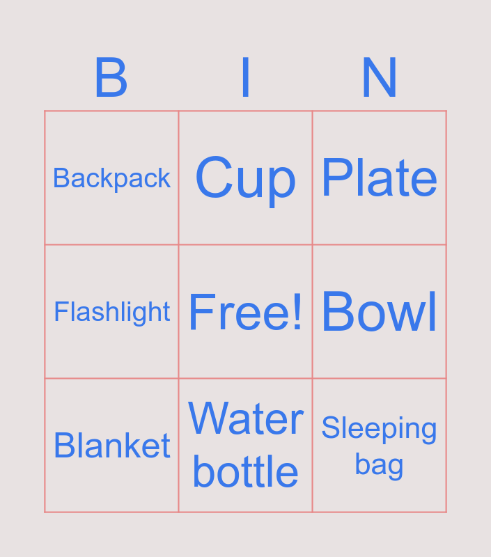 This bingo card has a free space and 11 words: Tent, Water bottle, Sleeping bag, Blanket, Cup, Plate, Bowl, Map, Flashlight, Backpack and Boots.