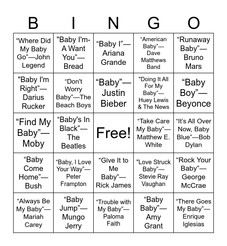 This bingo card has a free space and 27 words: "Love Struck Baby”—Stevie Ray Vaughan, “Ain’t That Lovin’ You Baby”—Jimmy Reed, "Doing It All For My Baby”—Huey Lewis & The News, “Trouble with My Baby”—Paloma Faith, "Baby I'm Right”—Darius Rucker, “Baby I”—Ariana Grande, "Baby I'm-A Want You”—Bread, “Baby Come Home”—Bush, “Take Care My Baby”—Matthew E. White, “Rock Your Baby”—George McCrae, “Find My Baby”—Moby, “American Baby”—Dave Matthews Band, “Always Be My Baby”—Mariah Carey, “Baby Jump”—Mungo Jerry, “Baby Boy”—Beyonce, "There Goes My Baby”—The Drifters, “Don't Worry Baby”—The Beach Boys, “Baby”—Justin Bieber, “Baby, I Love Your Way”—Peter Frampton, “Where Did My Baby Go”—John Legend, “It’s All Over Now, Baby Blue”—Bob Dylan, “Baby Baby”—Amy Grant, “Baby's In Black”—The Beatles, “There Goes My Baby”—Enrique Iglesias, “Give It to Me Baby”—Rick James, “Runaway Baby”—Bruno Mars and “Baby By Me”—50 Cent.