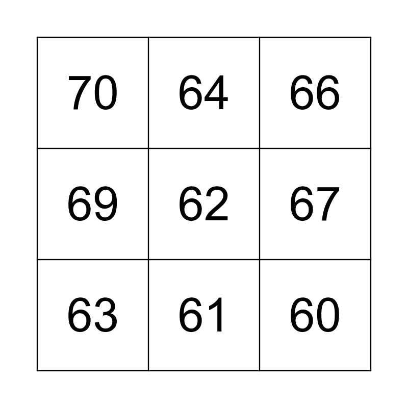 This bingo card has 11 words: 60, 61, 62, 63, 64, 66, 67, 68, 69, 70 and 71.
