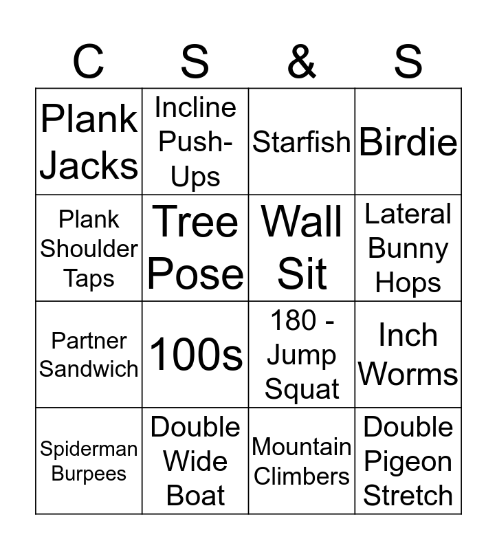 This bingo card has a free space and 15 words: Spiderman Burpees, Double Pigeon Stretch, Starfish, Plank Jacks, Lateral Bunny Hops, Plank Shoulder Taps, 100s, Mountain Climbers, Tree Pose, Partner Sandwich, Inch Worms, Birdie, Wall Sit, Incline Push-Ups and Double Wide Boat.