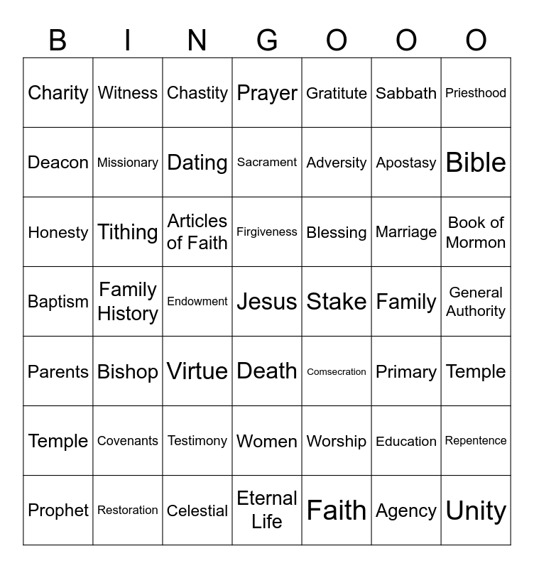 This bingo card has a free space and 55 words: Faith, Book of Mormon, Plan of Salvation, Charity, Family History, Covenants, Priesthood, Atonement, Missionary, Testimony, Prayer, Temple, General Authority, Family, Prophet, Parents, Gratitute, Adversity, Agency, Apostasy, Bible, Bishop, Blessing, Chastity, Councils, Deacon, Endowment, Grace, Honesty, Marriage, Ordinence, Primary, Repentence, Restoration, Sabbath, Sacrament, Temple, Tithing, Unity, Virtue, Witness, Women, Worship, Zion, Articles of Faith, Baptism, Celestial, Comsecration, Stake, Dating, Death, Education, Eternal Life, Firgiveness and Parents.
