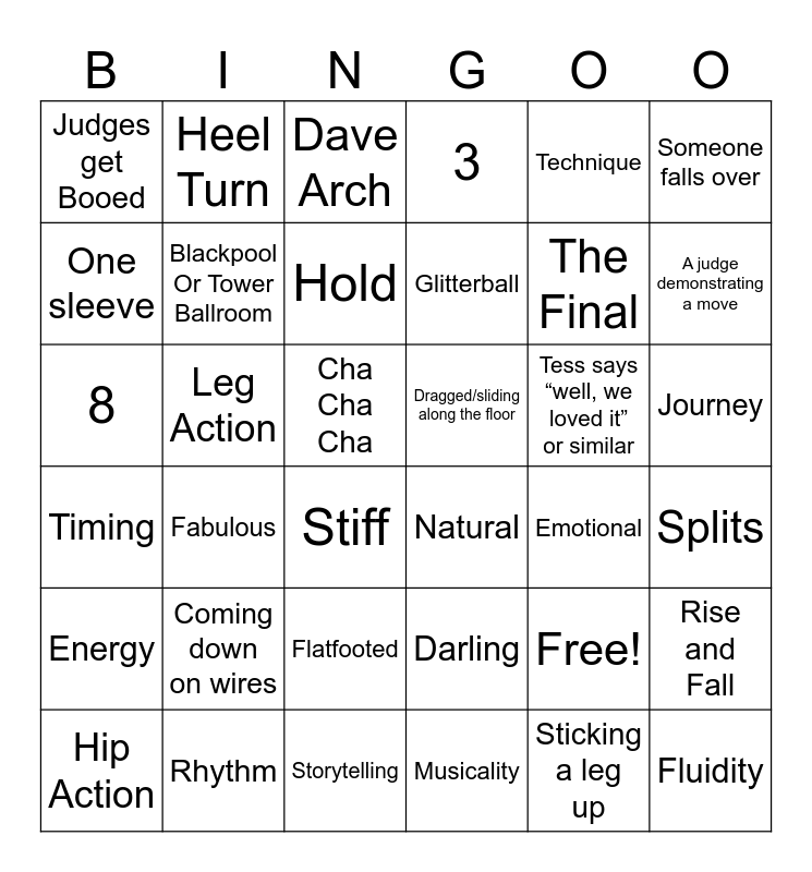 This bingo card has 37 words: Free!, Darling, Sticking a leg up, One sleeve, Fabulous, Tess says “well, we loved it” or similar, Blackpool Or Tower Ballroom, Musicality, Technique, Hip Action, A judge demonstrating a move, 3, 8, Cha Cha Cha, Someone falls over, Dragged/sliding along the floor, Coming down on wires, Dave Arch, Journey, Leg Action, Judges get Booed, Glitterball, Stiff, Emotional, Rhythm, Splits, Heel Turn, Storytelling, Rise and Fall, Flatfooted, Footwork, Natural, The Final, Energy, Timing, Hold and Fluidity.