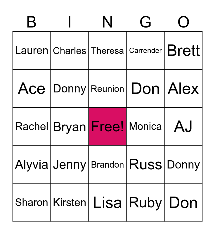 This bingo card has a free space and 24 words: Jenny, Kirsten, Reunion, Sharon, Brett, Lauren, Ace, Charles, Monica, Brandon, Don, Rachel, Russ, Donny, Donny, Ruby, AJ, Theresa, Alex, Bryan, Don, Alyvia, Carrender and Lisa.