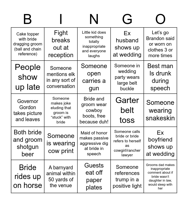 This bingo card has a free space and 24 words: Someone is wearing cow print, A barnyard animal within 50 yards of the venue, Someone open carries a gun, Bride rides up on horse, Let’s go Brandon said or worn on clothes 3 or more times, Cake topper with bride dragging groom (ball and chain reference), People show up late, Fight breaks out at reception, Garter belt toss, Maid of honor makes passive aggressive dig at bride in speech, Someone in wedding party wears large belt buckle, Governor Gordon takes picture and leaves, Someone calls bride or bride refers to herself as cowgirl/rancher lawyer, Ex boyfriend shows up at wedding, Someone mentions elk in any sort of conversation, Someone references trump in a positive light, Someone wearing snakeskin, Little kid does something totally inappropriate and everyone laughs, Best man Is drunk during speech, Someone makes joke eluding that groom is “stuck” with bride, Grooms dad makes inappropriate comment about if bride wasn’t daughter in law, would sleep with her, Both bride and groom shotgun beer, Ex husband shows up at wedding and Guests eat off paper plates.