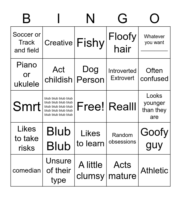 This bingo card has a free space and 24 words: Blub Blub, Unsure of their type, Dog Person, comedian, Whatever you want __________, Soccer or Track and field, Piano or ukulele, Creative, Realll, Likes to learn, Introverted Extrovert, Smrt, Random obsessions, Goofy guy, Act childish, Acts mature, Looks younger than they are, Fishy, Often confused, blub blub blub blub blub blub blub blub blub blub blub blub blub blub blub blub blub blub blub blub, Athletic, Likes to take risks, Floofy hair and A little clumsy.
