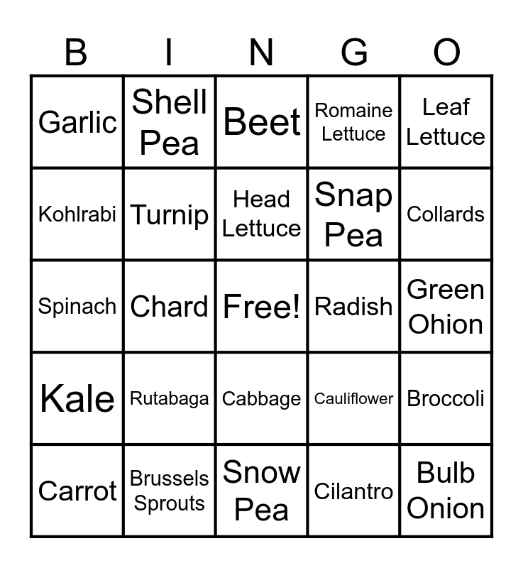 This bingo card has a free space and 24 words: Rutabaga, Brussels Sprouts, Head Lettuce, Carrot, Leaf Lettuce, Garlic, Kohlrabi, Shell Pea, Radish, Cabbage, Snap Pea, Spinach, Cauliflower, Broccoli, Turnip, Cilantro, Green Ohion, Beet, Collards, Chard, Bulb Onion, Kale, Romaine Lettuce and Snow Pea.