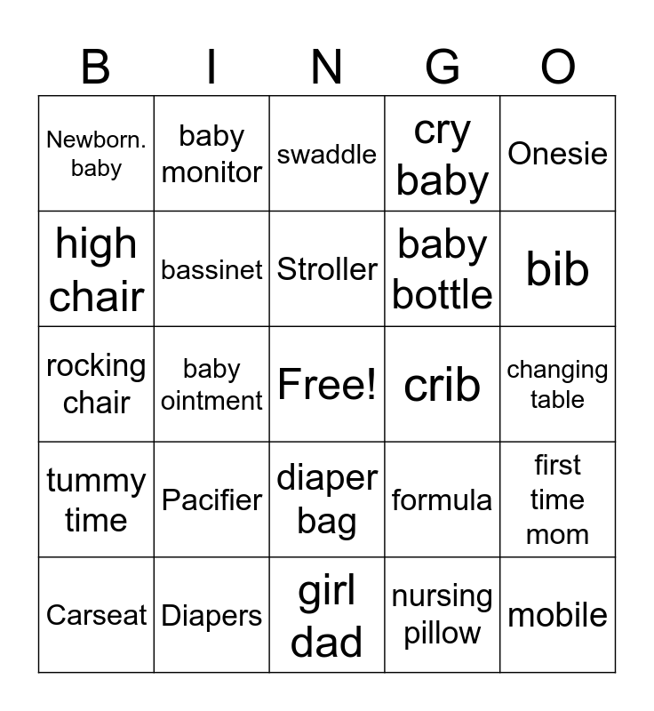 This bingo card has a free space and 24 words: Pacifier, Diapers, Stroller, Carseat, Onesie, Newborn. baby, high chair, baby monitor, crib, diaper bag, baby bottle, rocking chair, formula, first time mom, bassinet, nursing pillow, changing table, swaddle, bib, baby ointment, mobile, tummy time, cry baby and girl dad.