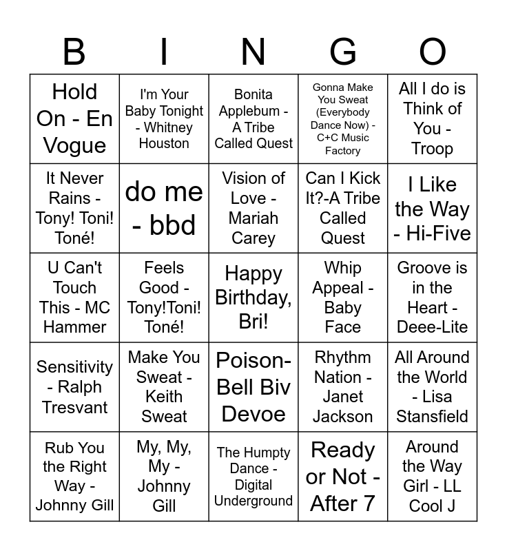 This bingo card has a free space and 26 words: Poison- Bell Biv Devoe, Ready or Not - After 7, Vision of Love - Mariah Carey, My, My, My - Johnny Gill, All I do is Think of You - Troop, Hold On - En Vogue, It Never Rains - Tony! Toni! Toné!, I'm Your Baby Tonight - Whitney Houston, Groove is in the Heart - Deee-Lite, Rhythm Nation - Janet Jackson, Can I Kick It?-A Tribe Called Quest, U Can't Touch This - MC Hammer, All Around the World - Lisa Stansfield, Rub You the Right Way - Johnny Gill, Feels Good - Tony!Toni! Toné!, Escapade - Janet Jackson, Gonna Make You Sweat (Everybody Dance Now) - C+C Music Factory, Sensitivity - Ralph Tresvant, Bonita Applebum - A Tribe Called Quest, Around the Way Girl - LL Cool J, I Like the Way - Hi-Five, The Humpty Dance - Digital Underground, Whip Appeal - Baby Face, Make You Sweat - Keith Sweat, do me - bbd and extra.