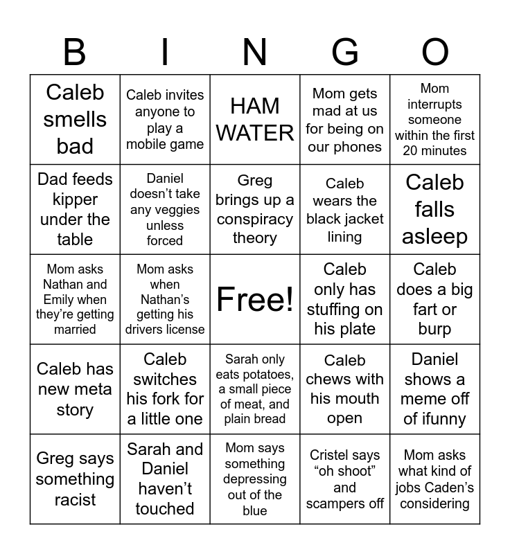 This bingo card has a free space and 24 words: Caleb switches his fork for a little one, Sarah and Daniel haven’t touched, Greg brings up a conspiracy theory, Greg says something racist, Mom interrupts someone within the first 20 minutes, Caleb smells bad, Dad feeds kipper under the table, Caleb invites anyone to play a mobile game, Caleb only has stuffing on his plate, Sarah only eats potatoes, a small piece of meat, and plain bread, Caleb wears the black jacket lining, Mom asks Nathan and Emily when they’re getting married, Caleb chews with his mouth open, Daniel shows a meme off of ifunny, Daniel doesn’t take any veggies unless forced, Cristel says “oh shoot” and scampers off, Caleb does a big fart or burp, HAM WATER, Caleb falls asleep, Mom asks when Nathan’s getting his drivers license, Mom asks what kind of jobs Caden’s considering, Caleb has new meta story, Mom gets mad at us for being on our phones and Mom says something depressing out of the blue.