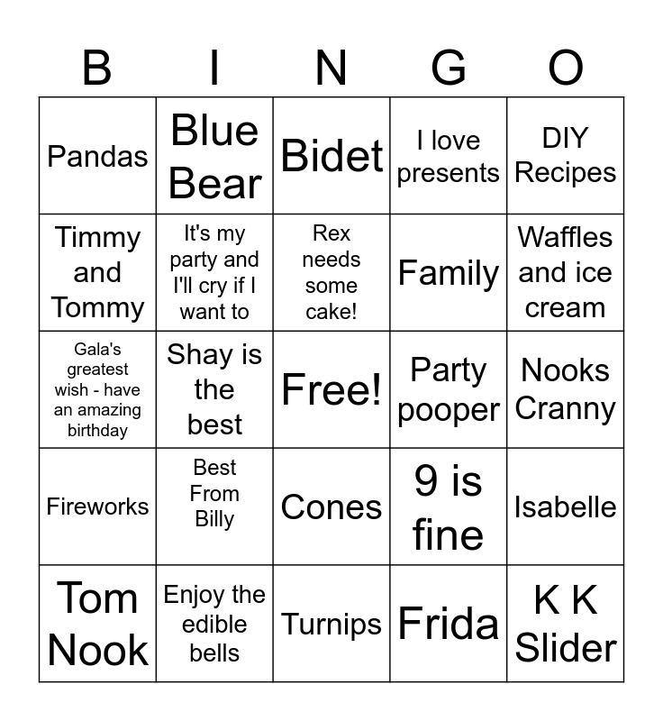 This bingo card has a free space and 24 words: Best From Billy, Enjoy the edible bells, Rex needs some cake!, Tom Nook, DIY Recipes, Pandas, Timmy and Tommy, Blue Bear, Party pooper, Cones, Family, Gala's greatest wish - have an amazing birthday, 9 is fine, Isabelle, It's my party and I'll cry if I want to, Frida, Nooks Cranny, Bidet, Waffles and ice cream, Shay is the best, K K Slider, Fireworks, I love presents and Turnips.