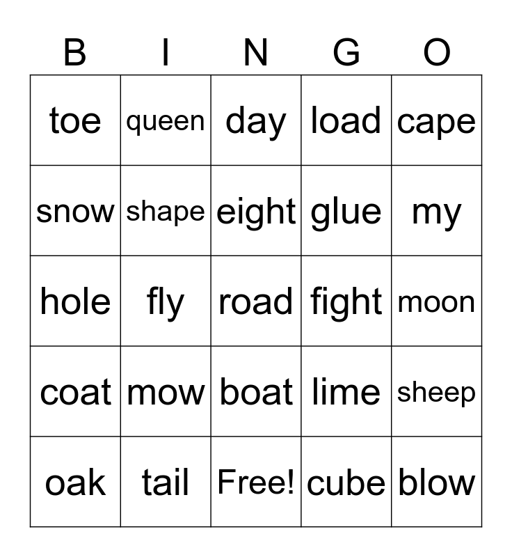 This bingo card has 25 words: coat, tail, road, cube, cape, toe, queen, day, fight, sheep, snow, shape, Free!, lime, my, oak, fly, eight, glue, moon, hole, mow, boat, load and blow.