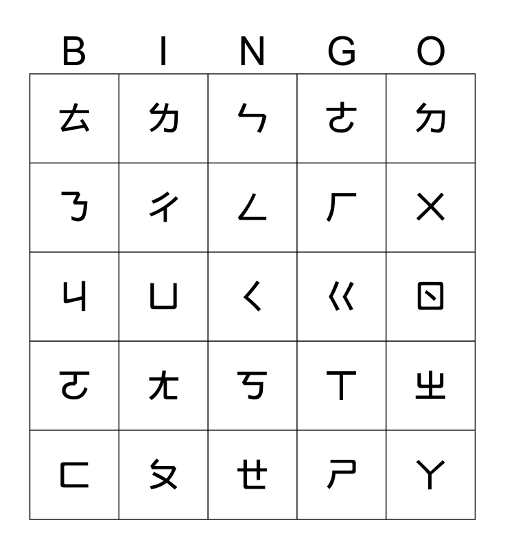 This bingo card has a free space and 24 words: ㄤ, ㄆ, ㄥ, ㄈ, ㄉ, ㄊ, ㄋ, ㄌ, ㄍ, ㄎ, ㄏ, ㄐ, ㄒ, ㄓ, ㄔ, ㄕ, ㄖ, ㄣ, ㄨ, ㄩ, ㄚ, ㄛ, ㄜ and ㄝ.