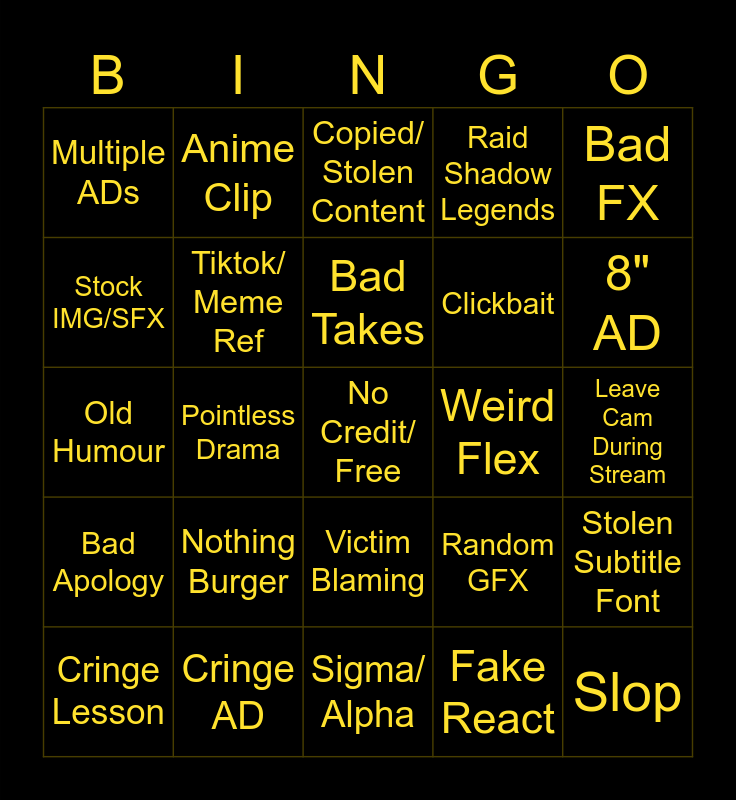This bingo card has a free space and 24 words: Nothing Burger, Cringe AD, Bad Takes, Cringe Lesson, Bad FX, Multiple ADs, Stock IMG/SFX, Anime Clip, Weird Flex, Victim Blaming, Clickbait, Old Humour, Random GFX, Stolen Subtitle Font, Tiktok/ Meme Ref, Fake React, Leave Cam During Stream, Copied/ Stolen Content, 8" AD, Pointless Drama, Slop, Bad Apology, Raid Shadow Legends and Sigma/ Alpha.