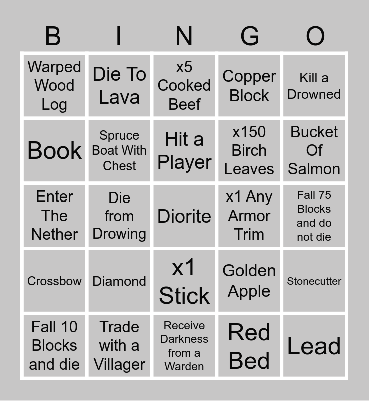 This bingo card has a free space and 24 words: Diamond, Trade with a Villager, Hit a Player, Fall 10 Blocks and die, Kill a Drowned, Warped Wood Log, Book, Die To Lava, x1 Any Armor Trim, x1 Stick, x150 Birch Leaves, Enter The Nether, Golden Apple, Stonecutter, Spruce Boat With Chest, Red Bed, Fall 75 Blocks and do not die, x5 Cooked Beef, Bucket Of Salmon, Die from Drowing, Lead, Crossbow, Copper Block and Receive Darkness from a Warden.