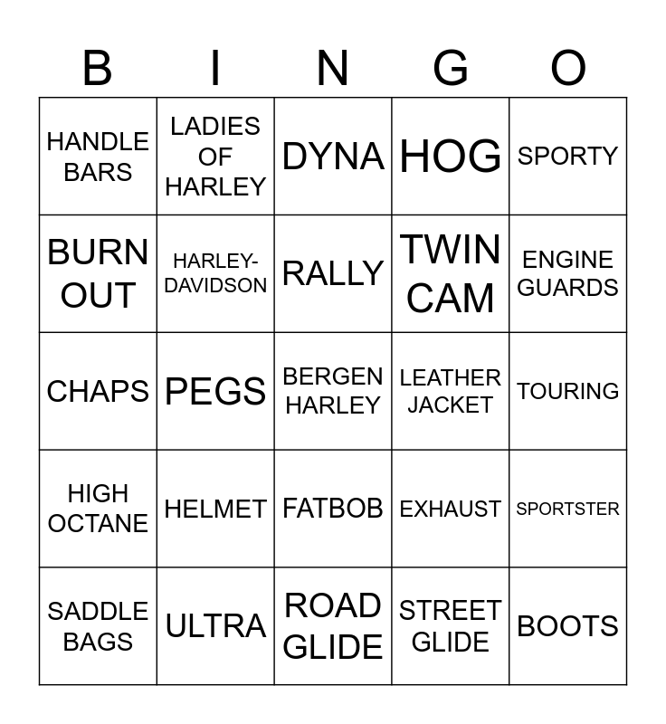 This bingo card has a free space and 29 words: SADDLE BAGS, SOFTAIL, PEGS, FATBOY, HANDLE BARS, DYNA, HARLEY- DAVIDSON, HELMET, LEATHER JACKET, ULTRA, TOURING, BOOTS, ROAD GLIDE, STREET GLIDE, ENGINE GUARDS, SCREAMIN EAGLE, FATBOB, HIGH OCTANE, SPORTY, CHAPS, EXHAUST, SISSY BAR, TWIN CAM, BURN OUT, HOG, LADIES OF HARLEY, SPORTSTER, RALLY and WHEELIE.