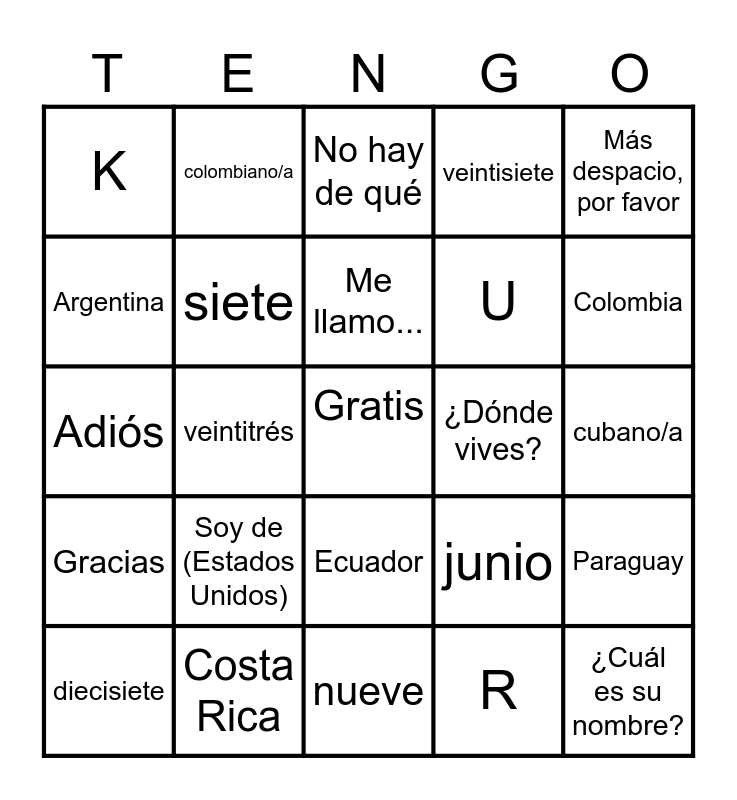This bingo card has a free space and 169 words: Hola, Buenos días, Buenas noches, Buenas tardes, Adiós, Nos vemos, Hasta luego, Hasta mañana, Hasta pronto, Chao, ¿Cómo te llamas?, ¿Cómo se llama usted?, Me llamo..., ¿Cuál es tu nombre?, ¿Cuál es su nombre?, Mi nombre es..., ¿Cuál es tu apellido?, ¿Cuál es su apellido?, Mi apellido es..., Mucho gusto, El gusto es mío, Igualmente, ¿Cómo se escribe tu nombre?, ¿Cómo se escribe tu apellido?, Se escribe..., ¿Cuál es tu número de teléfono?, uno, dos, tres, cuatro, cinco, seis, siete, ocho, nueve, diez, once, doce, trece, catorce, quince, dieciséis, diecisiete, dieciocho, diecinueve, veinte, veintiuno, veintidós, veintitrés, veinticuatro, veinticinco, veintiséis, veintisiete, veintiocho, veintinueve, treinta, ¿De dónde eres?, Soy de (Estados Unidos), ¿De dónde es usted?, Soy de (España), ¿Dónde vives?, ¿Dónde vive?, Vivo en (Downers Grove), Tú, Usted - Ud., ¿Qué tal?, ¿Qué pasa?, ¿Cómo está Ud.?, Cuba, cubano/a, Puerto Rico, puertorriqueño/a, La República Dominicana, dominicano/a, México, mexicano/a, España, español/a, Ecuatorial Guinea, (ecuato)guineano/a, Guatemala, guatemalteco/a, El Salvador, salvadoreño/a, Honduras, hondureño/a, Nicaragua, nicaragüense, Costa Rica, costarricense, Panamá, panameño/a, Venezuela, venezolano/a, Colombia, colombiano/a, Ecuador, ecuatoriano/a, Perú, peruano/a, Bolivia, boliviano/a, Uruguay, uruguayo/a, Paraguay, paraguayo/a, Chile, chileno/a, Argentina, argentino/a, Salud, Gracias, De (Por) nada, No hay de qué, Con permiso, Lo siento, Perdón, ¿Puedo ir al baño?, Más despacio, por favor, Necesito ayuda, A, B, C, CH, D, E, F, G, H, I, J, K, L, LL, M, N, Ñ, O, P, Q, R, RR, S, T, U, V, W, X, Y, Z, enero, febrero, marzo, abril, mayo, junio, julio, agosto, septiembre, octubre, noviembre, diciembre, lunes, martes, miércoles, jueves, viernes, sábado and domingo.