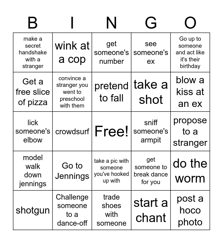 This bingo card has a free space and 24 words: Go to Jennings, Challenge someone to a dance-off, pretend to fall, shotgun, Go up to someone and act like it's their birthday, make a secret handshake with a stranger, Get a free slice of pizza, wink at a cop, sniff someone's armpit, take a pic with someone you've hooked up with, take a shot, lick someone's elbow, get someone to break dance for you, do the worm, convince a stranger you went to preschool with them, start a chant, propose to a stranger, get someone's number, blow a kiss at an ex, crowdsurf, post a hoco photo, model walk down jennings, see someone's ex and trade shoes with someone.