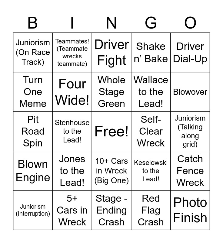 This bingo card has a free space and 24 words: Jones to the Lead!, 5+ Cars in Wreck, Whole Stage Green, Juniorism (Interruption), Driver Dial-Up, Juniorism (On Race Track), Turn One Meme, Teammates! (Teammate wrecks teammate), Self-Clear Wreck, 10+ Cars in Wreck (Big One), Wallace to the Lead!, Pit Road Spin, Keselowski to the Lead!, Catch Fence Wreck, Four Wide!, Red Flag Crash, Juniorism (Talking along grid), Driver Fight, Blowover, Stenhouse to the Lead!, Photo Finish, Blown Engine, Shake n’ Bake and Stage -Ending Crash.