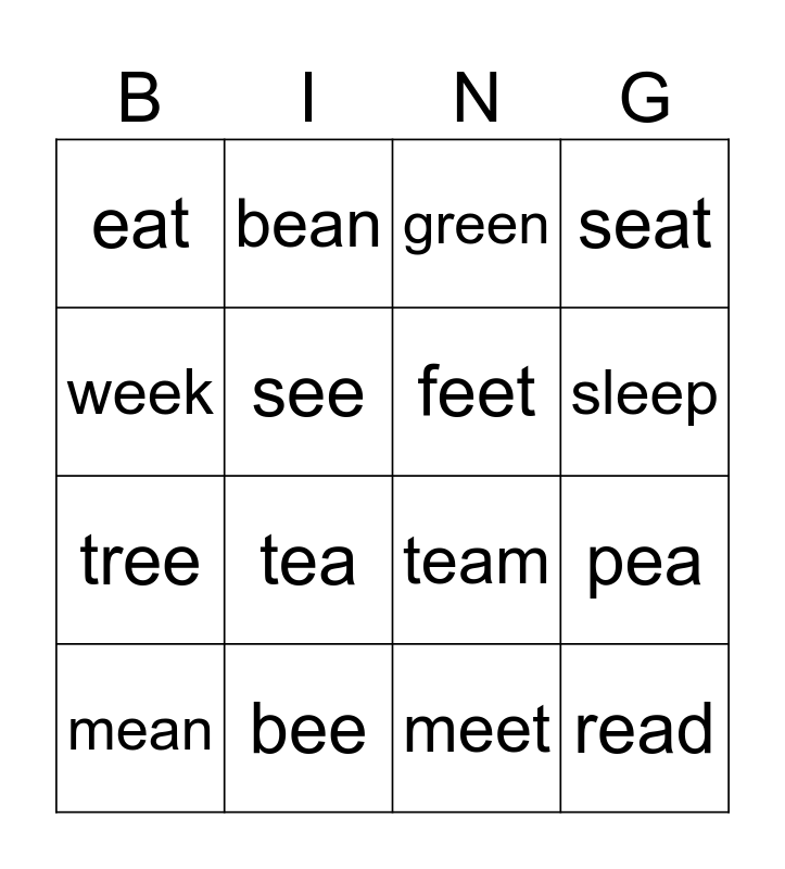 This bingo card has 16 words: bee, pea, green, eat, tree, bean, team, meet, week, see, mean, seat, tea, sleep, feet and read.