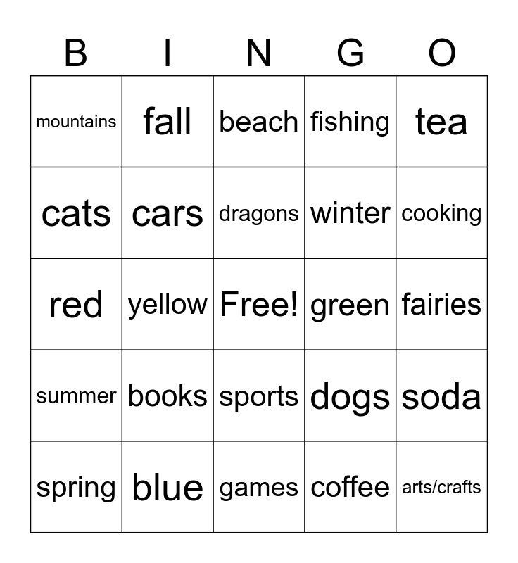 This bingo card has a free space and 24 words: books, blue, dragons, spring, tea, mountains, cats, fall, green, sports, winter, red, dogs, soda, cars, coffee, fairies, beach, cooking, yellow, arts/crafts, summer, fishing and games.