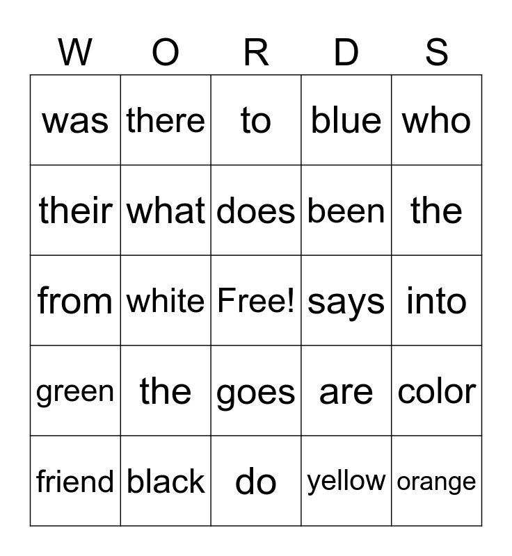 This bingo card has a free space and 25 words: the, do, does, friend, who, was, their, there, says, goes, been, from, are, color, what, of, into, to, the, white, orange, black, green, blue and yellow.