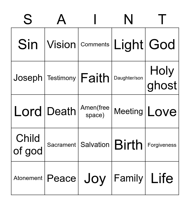 This bingo card has a free space and 29 words: Atonement, Trials, Death, Temptation, Sin, Comments, Testimony, Sacrament, Meeting, Peace, Love, Life, Joy, Family, Holy ghost, Jesus Christ, Salvation, Child of god, God, Lord, Birth, Youth, Daughter/son, Joseph, Light, Vision, Forgiveness, Faith and “New church”.