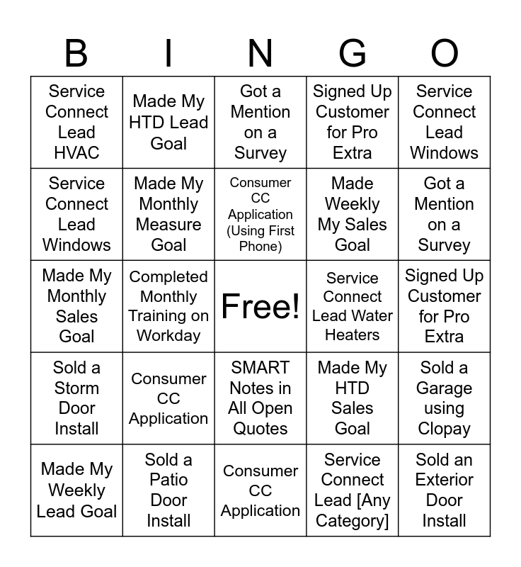 This bingo card has a free space and 25 words: Consumer CC Application, Consumer CC Application, Consumer CC Application (Using First Phone), Made My Weekly Lead Goal, Service Connect Lead Windows, Service Connect Lead HVAC, Service Connect Lead Windows, Made My HTD Lead Goal, Service Connect Lead Water Heaters, SMART Notes in All Open Quotes, Made Weekly My Sales Goal, Made My Monthly Sales Goal, Made My HTD Sales Goal, Sold a Garage using Clopay, Made My Monthly Measure Goal, Made My HTD Measure Goal, Signed Up Customer for Pro Extra, Got a Mention on a Survey, Got a Mention on a Survey, Completed Monthly Training on Workday, Sold an Exterior Door Install, Sold a Patio Door Install, Sold a Storm Door Install, Signed Up Customer for Pro Extra and Service Connect Lead [Any Category].