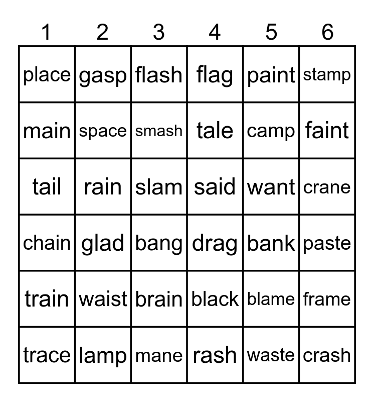 This bingo card has 36 words: black, brain, rash, main, chain, said, space, mane, paint, blame, faint, flag, frame, rain, tale, place, train, want, tail, flash, slam, glad, drag, bang, bank, gasp, camp, lamp, smash, stamp, crash, trace, paste, crane, waist and waste.