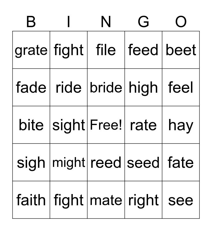 This bingo card has a free space and 35 words: late, light, right, ride, reed, feed, fade, braid, bride, bright, bite, beet, bee, bay, grate, rate, right, sight, sigh, see, seed, faith, fate, fight, file, feel, feed, seed, high, hay, may, mate, might, fight and feet.