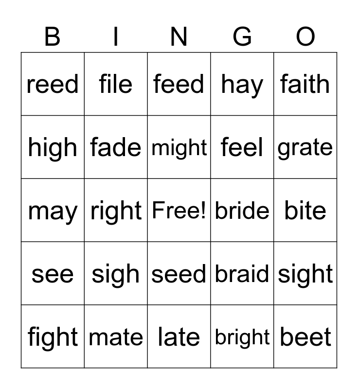 This bingo card has a free space and 31 words: late, light, right, ride, reed, feed, fade, braid, bride, bright, bite, beet, bee, bay, grate, rate, sight, sigh, see, seed, faith, fate, fight, file, feel, high, hay, may, mate, might and feet.