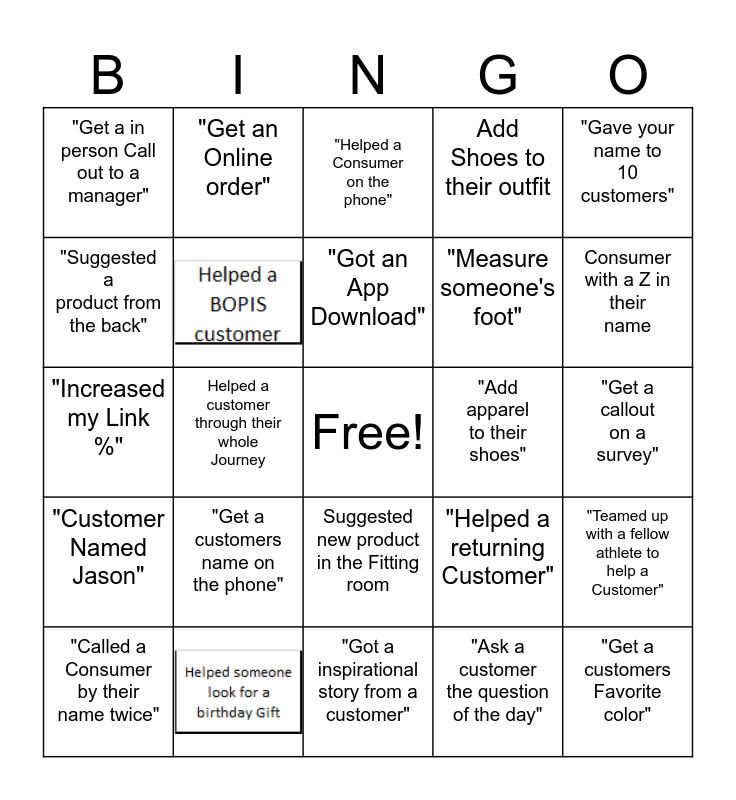 This bingo card has 2 images, a free space and 22 words: "Get a customers name on the phone", "Got an App Download", "Called a Consumer by their name twice", "Gave your name to 10 customers", "Get a in person Call out to a manager", "Suggested a product from the back", "Get an Online order", "Add apparel to their shoes", Suggested new product in the Fitting room, "Measure someone's foot", "Increased my Link %", "Helped a returning Customer", "Teamed up with a fellow athlete to help a Customer", "Ask a customer the question of the day", "Get a callout on a survey", "Helped a Consumer on the phone", Consumer with a Z in their name, Helped a customer through their whole Journey, "Get a customers Favorite color", "Customer Named Jason", Add Shoes to their outfit and "Got a inspirational story from a customer".