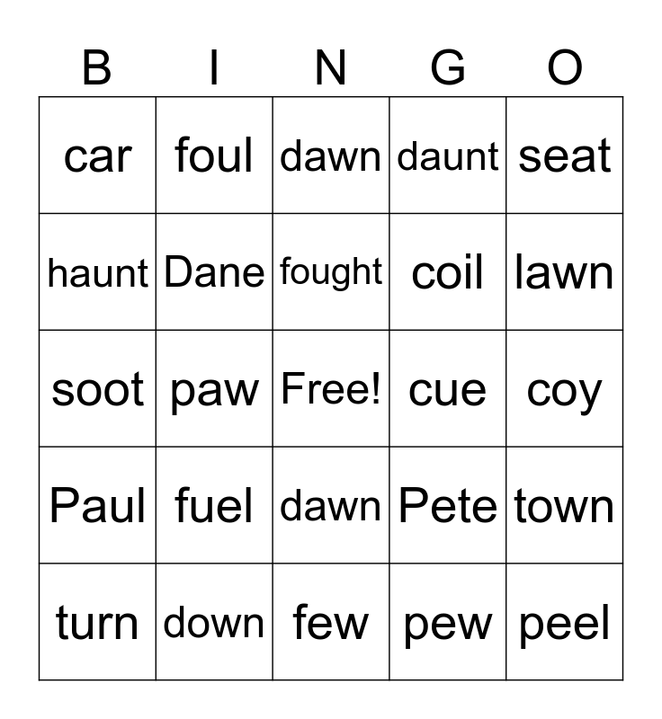 This bingo card has a free space and 35 words: duke, dew, day, Dane, dawn, daunt, haunt, fault, fought, foot, soot, seat, neat, newt, car, cue, pew, paw, Paul, peel, Pete, turn, town, down, dawn, lawn, loon, loop, coil, coy, cue, few, fuel, foul and howl.