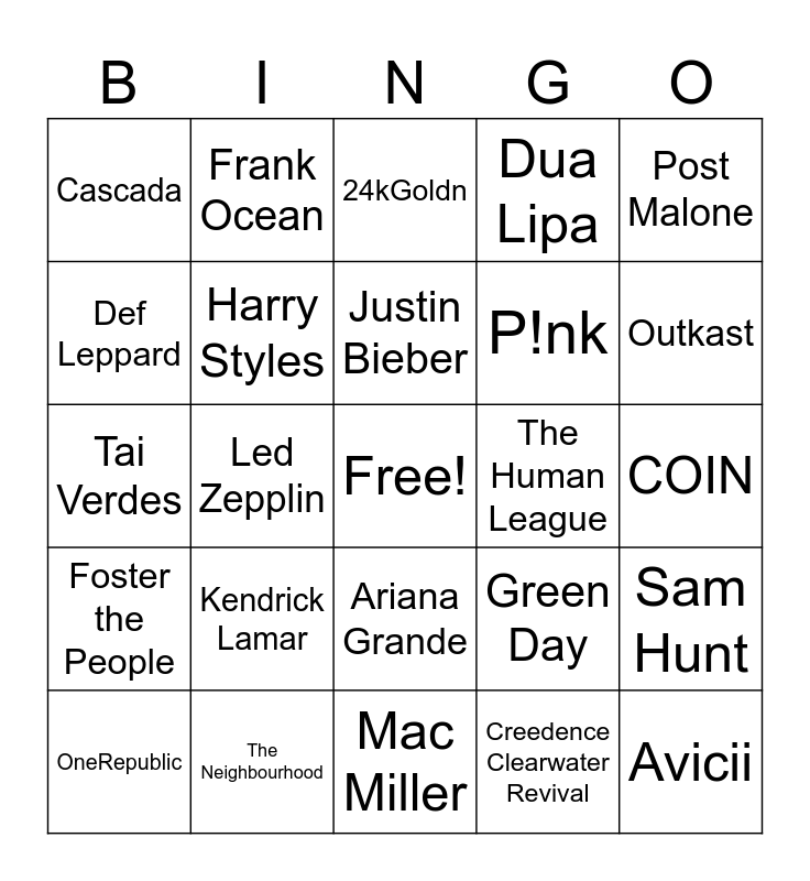 This bingo card has a free space and 92 words: Luke Combs, Owl City, Mac Miller, Johnny Cash, Luther Vandross, Scorpions, Taylor Swift, OneRepublic, Tyler Childers, Morgan Wallen, UB40, SZA, The Rolling Stones, P!nk, The 1975, Post Malone, 24kGoldn, Kanye West, Amine, Arctic Monkeys, Thomas Rhett, Lil Uzi Vert, The White Stripes, A$AP Rocky, Kendrick Lamar, Harry Styles, J. Cole, The Weeknd, Bruno Mars, Anderson .Paak, Guns N' Roses, The Neighbourhood, Ariana Grande, Midland, Khalid, Frank Ocean, Sean Kingston, David Guetta, Machine Gun Kelly, Justin Bieber, Green Day, Tai Verdes, Foster the People, COIN, The Kid LAROI, Avicii, Neon Trees, Ed Sheeran, GROUPLOVE, Shawn Mendes, Boston, Travis Scott, JID, Eminem, Coldplay, Florida Georgia Line, Brad Paisley, AC/DC, Def Leppard, Poison, Led Zepplin, Bazzi, Nirvana, KISS, BROCKHAMPTON, Logic, Creedence Clearwater Revival, The Walters, Future, My Chemical Romance, Katy Perry, BJ The Chicago Kid, Big Time Rush, Dua Lipa, Camila Cabello, Selena Gomez, Miley Cyrus, Sam Hunt, Hootie & The Blowfish, Stevie Wonder, Zac Brown Band, *NSYNC, The Human League, Cascada, Britney Spears, Alicia Keys, Social House, The Backseat Lovers, Van Morrison, Tesher, Queen, Outkast and Jack Black.