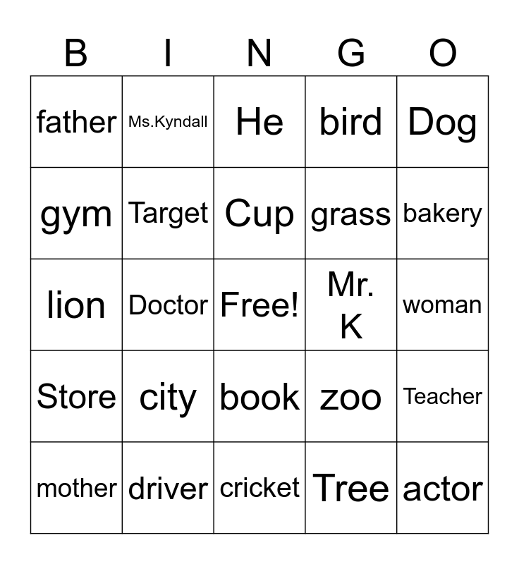 This bingo card has a free space and 32 words: Tree, Pizza, Doctor, School, Store, Target, Dog, Teacher, Ms.Kyndall, Shoe, Cup, He, Mirror, Walmart, Mr. K, We, mother, lion, book, city, zoo, cat, woman, driver, actor, bird, grass, gym, father, cricket, watch and bakery.
