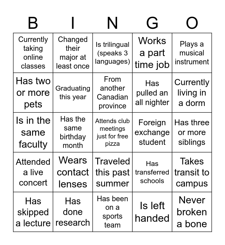 This bingo card has a free space and 24 words: Wears contact lenses, Has done research, From another Canadian province, Has skipped a lecture, Plays a musical instrument, Currently taking online classes, Has two or more pets, Changed their major at least once, Foreign exchange student, Traveled this past summer, Has pulled an all nighter, Is in the same faculty, Has transferred schools, Takes transit to campus, Graduating this year, Is left handed, Has three or more siblings, Is trilingual (speaks 3 languages), Currently living in a dorm, Has the same birthday month, Never broken a bone, Attended a live concert, Works a part time job and Has been on a sports team.