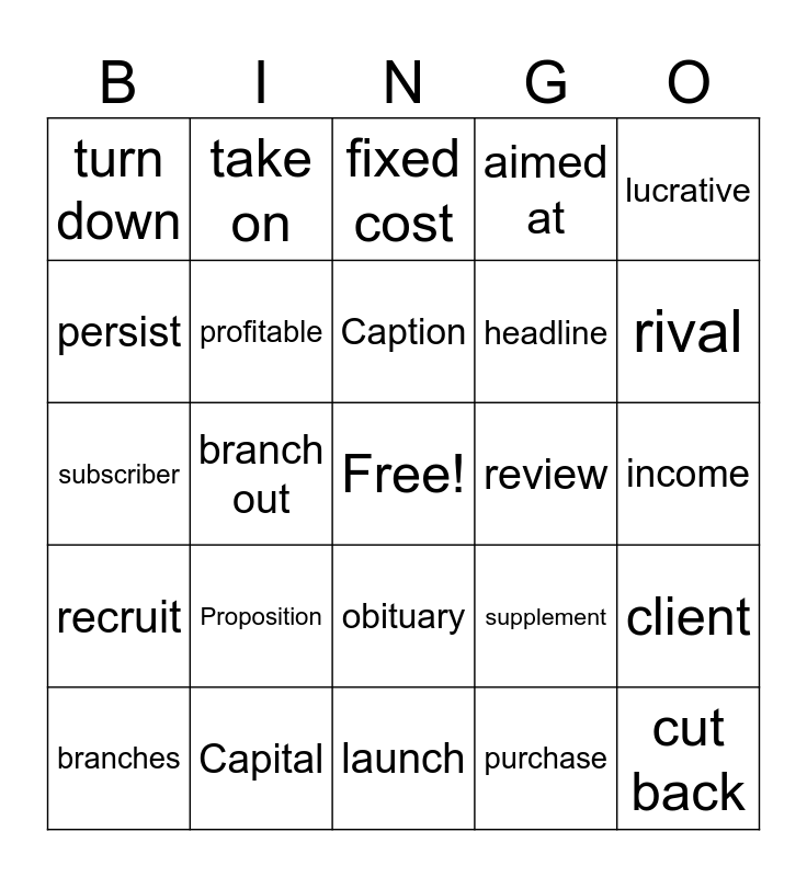 This bingo card has a free space and 24 words: Proposition, Capital, Caption, branches, lucrative, turn down, persist, take on, review, obituary, headline, subscriber, supplement, client, profitable, purchase, income, fixed cost, rival, branch out, cut back, recruit, aimed at and launch.